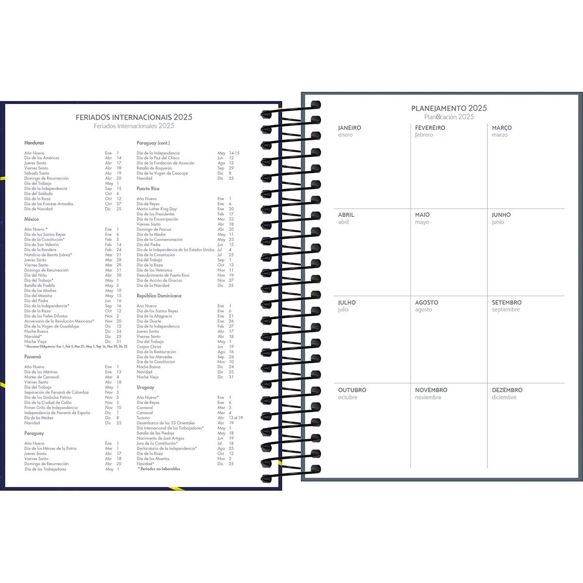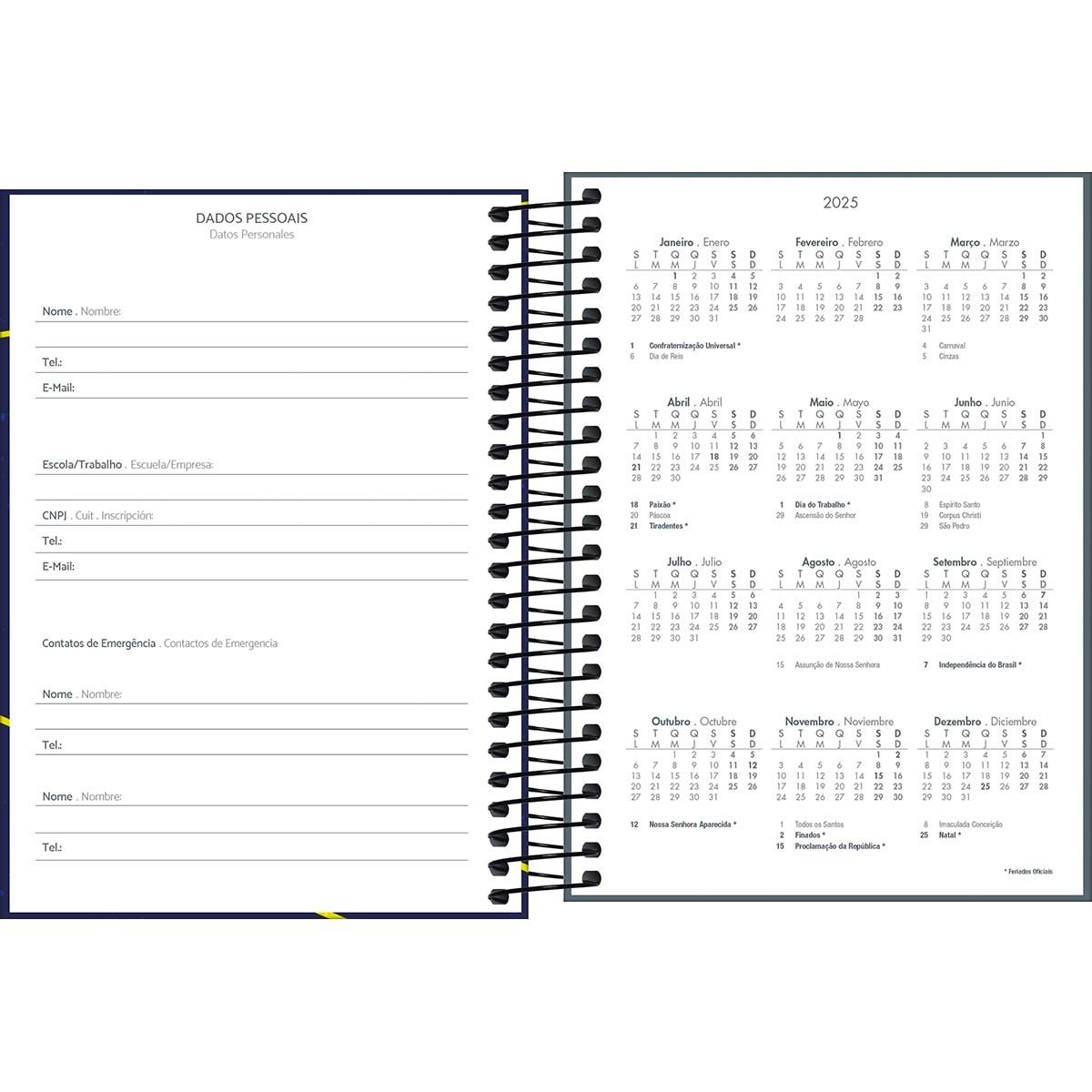 Agenda espiralada com visão de 1 dia por página, exceto sábado e domingo. Possui capa dura e bolsa plástica para guardar trabalhos e anotações. Ideal para a organização do dia a dia.