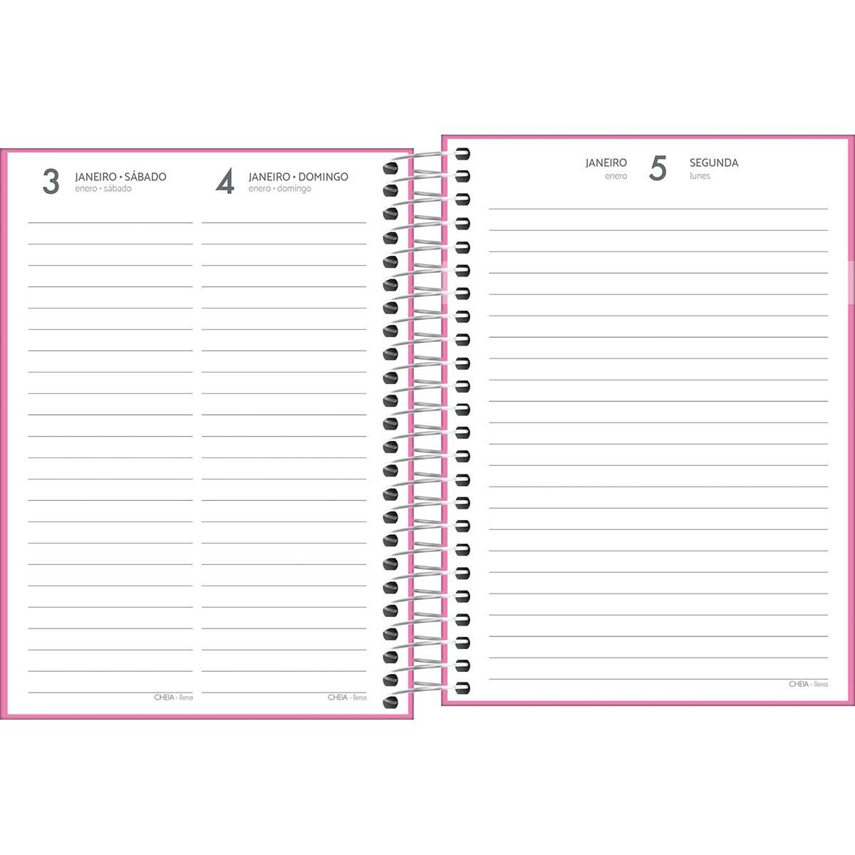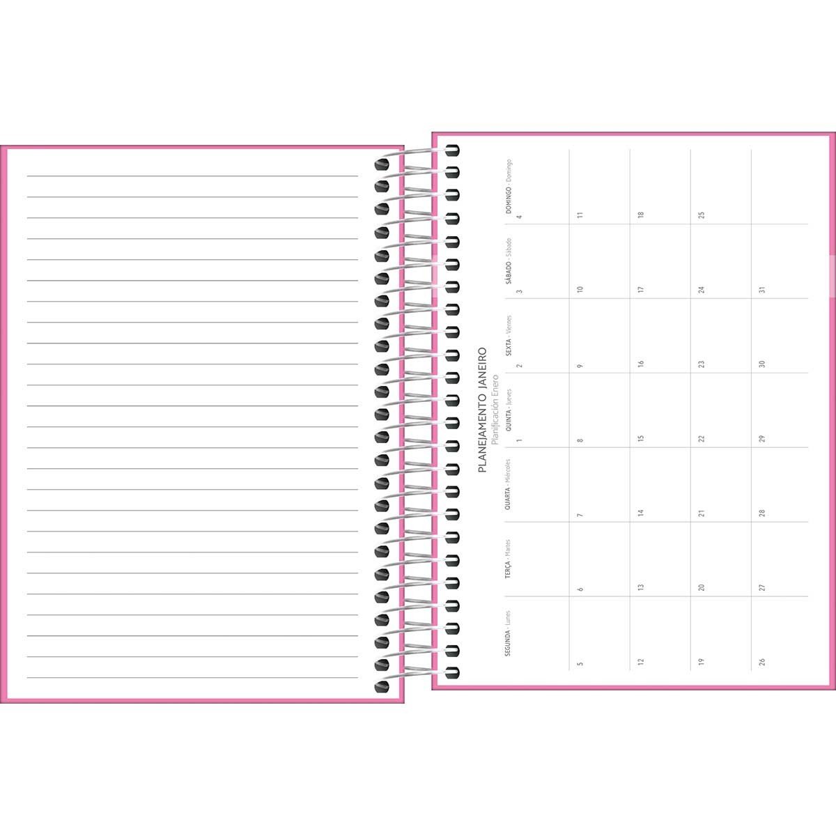 Agenda espiralada com visão de 1 dia por página, exceto sábado e domingo. Possui capa dura e bolsa plástica para guardar trabalhos e anotações. Ideal para a organização do dia a dia.