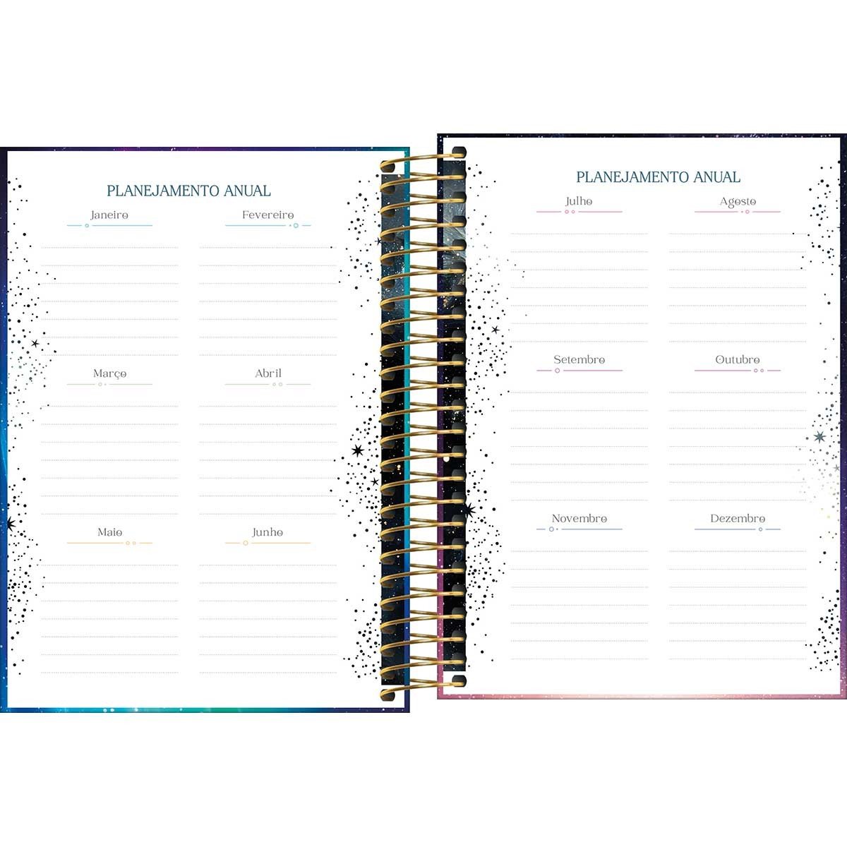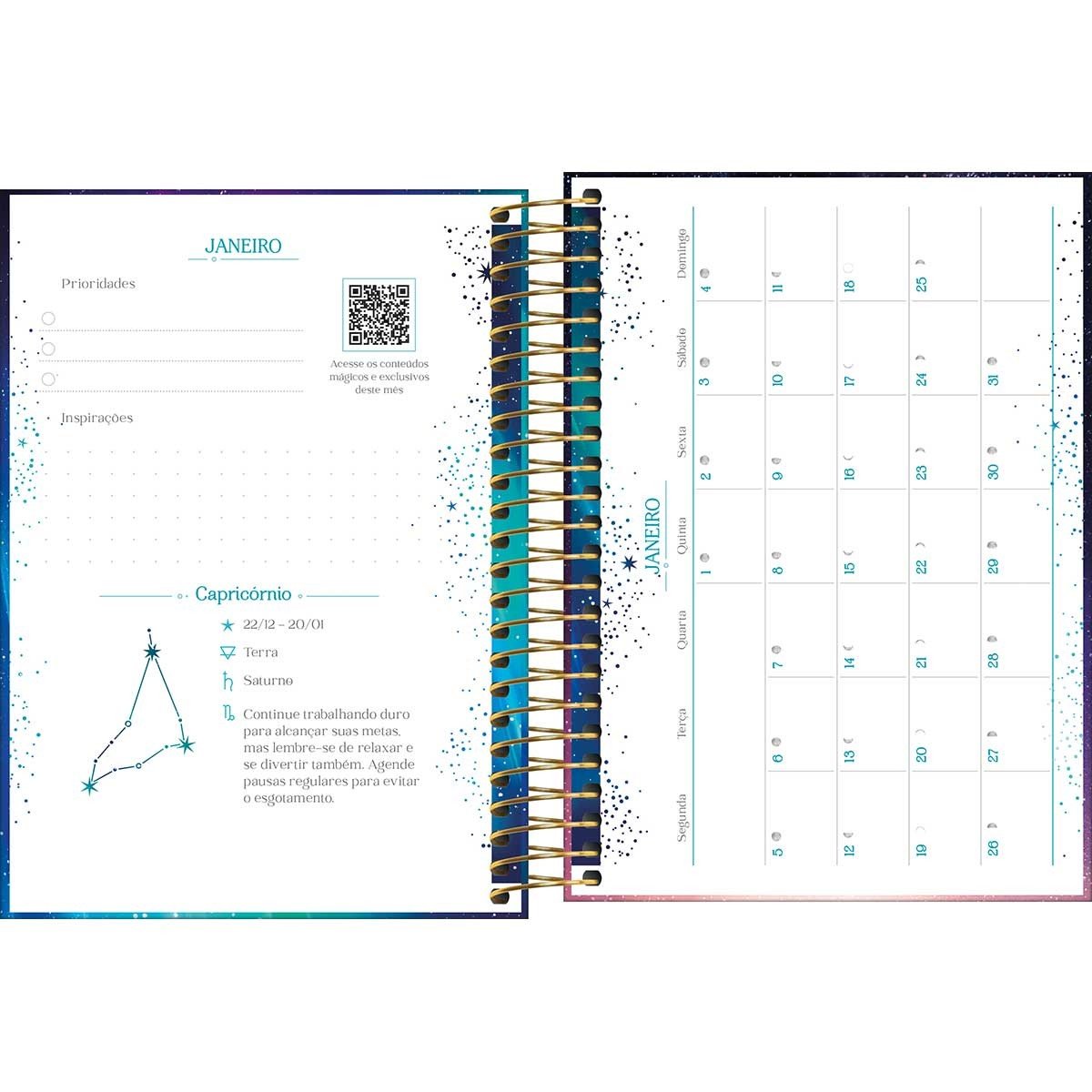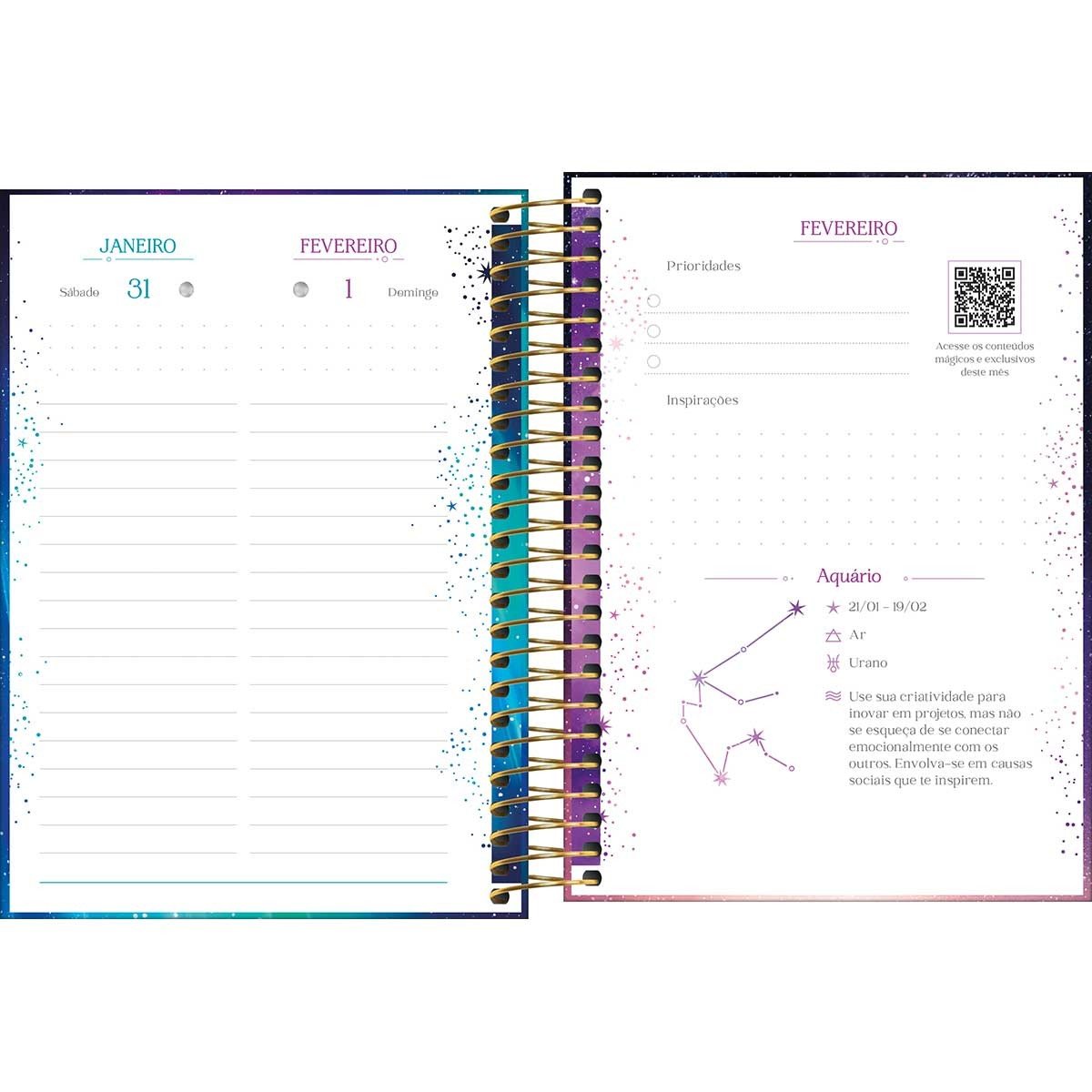 O Planner Espiral 11 x 16 cm Magic 2026 pode ser usado para organizar os compromissos do dia a dia, em casa, no trabalho e na escola. O produto, com visão anual, mensal e semanal, além de folhas para anotações, tem capa dura com detalhe metalizado, espiral colorido, 176 folhas, adesivos e bolsa de papel para guardar documentos.