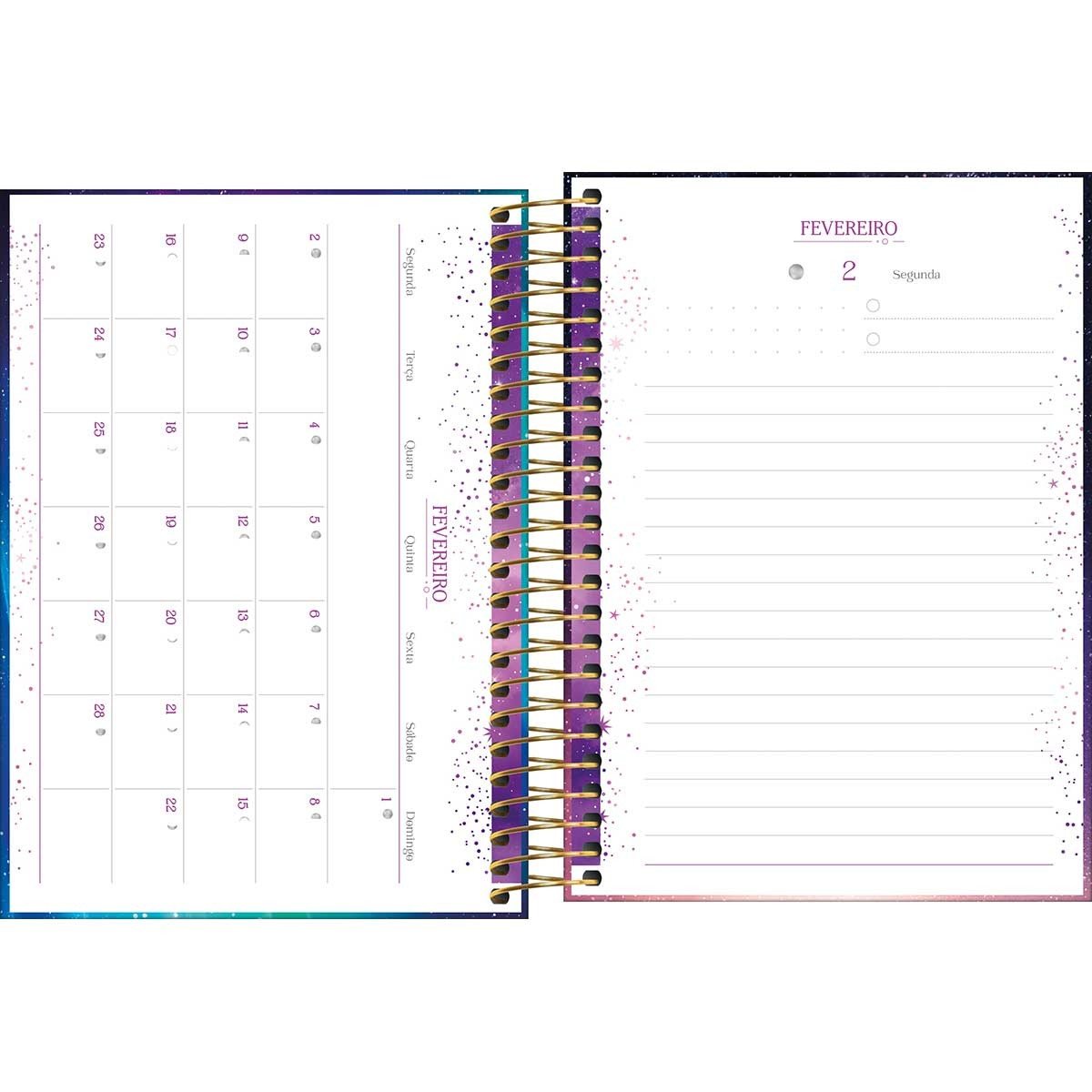 O Planner Espiral 11 x 16 cm Magic 2026 pode ser usado para organizar os compromissos do dia a dia, em casa, no trabalho e na escola. O produto, com visão anual, mensal e semanal, além de folhas para anotações, tem capa dura com detalhe metalizado, espiral colorido, 176 folhas, adesivos e bolsa de papel para guardar documentos.