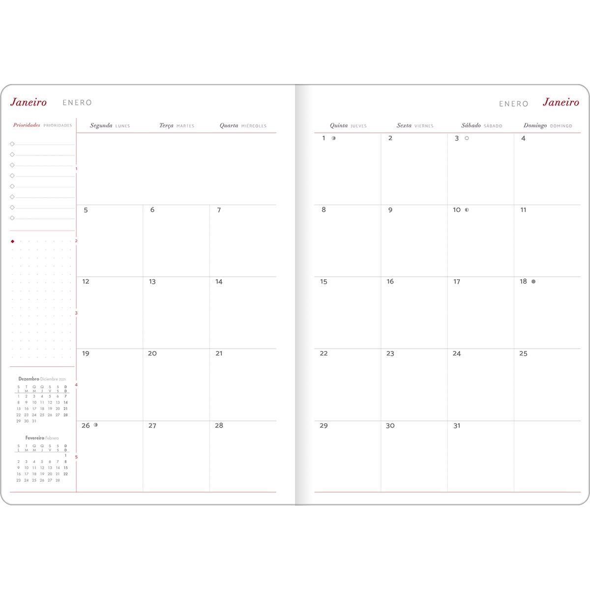 O Planner Executivo Grampeado 17,8 x 25,4 cm Cambridge 90 G 2026 pode ser usado para organizar os compromissos do dia a dia, em casa e no trabalho. O produto tem capa flexível, visões anual e mensal e miolo com 20 folhas, com gramatura 90 g/m².