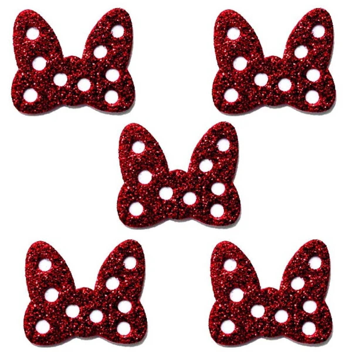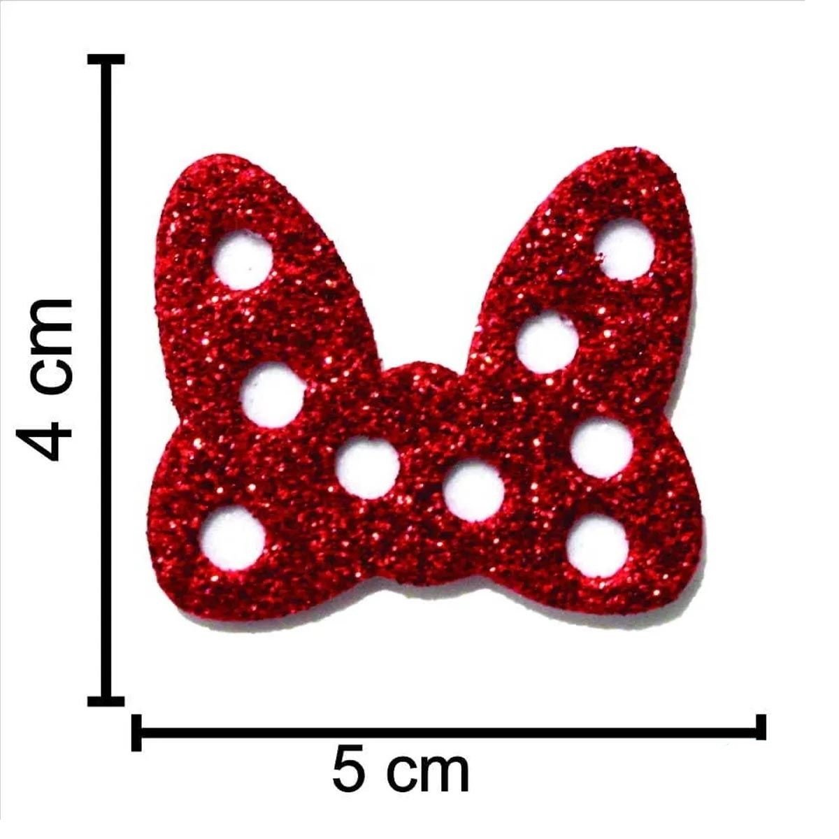 O aplique EVA com a temática da Minnie Mouse da Disney, da marca Piffer, é um laço vermelho e branco feito de EVA glitter e contém 5 unidades, é uma ótima escolha para quem deseja decorar sua festa temática da Disney.