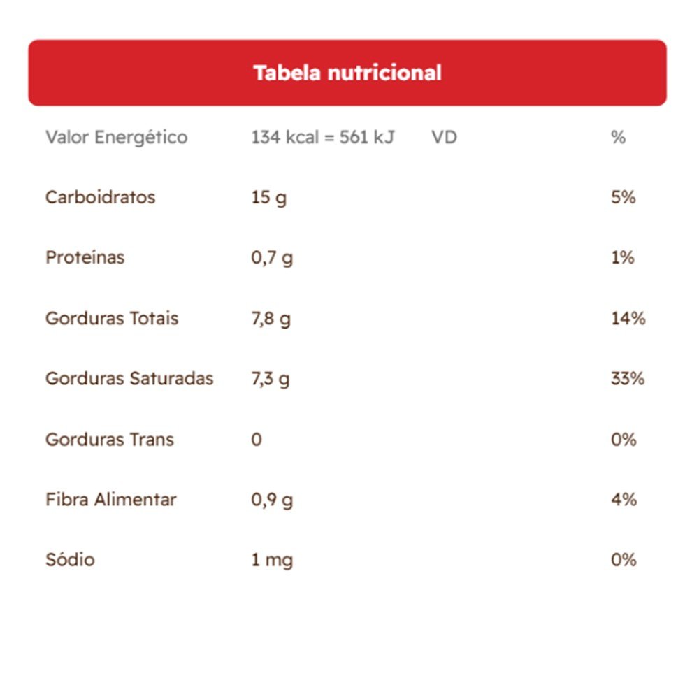 Açúcar, gordura vegetal, cacau em pó, leite integral em pó, emulsificantes: lecitina de soja e ésteres de ácido ricinoléico interesterificado como poliglicerol e aromatizante.