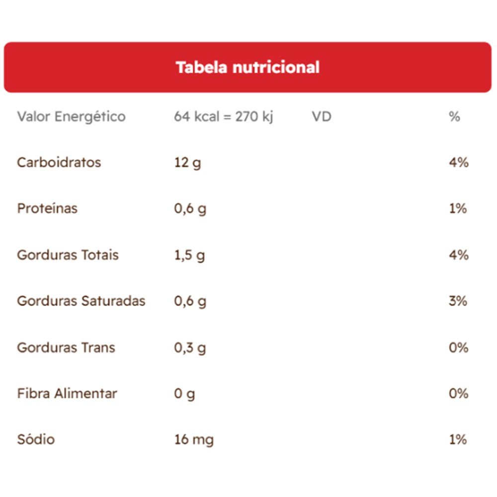 Açúcar, água, leite em pó, amido, gordura vegetal, cacau em pó, conservante INS 202, espessante INS 440, emulsificante INS 471 e aromatizante artificial de leite condensado.