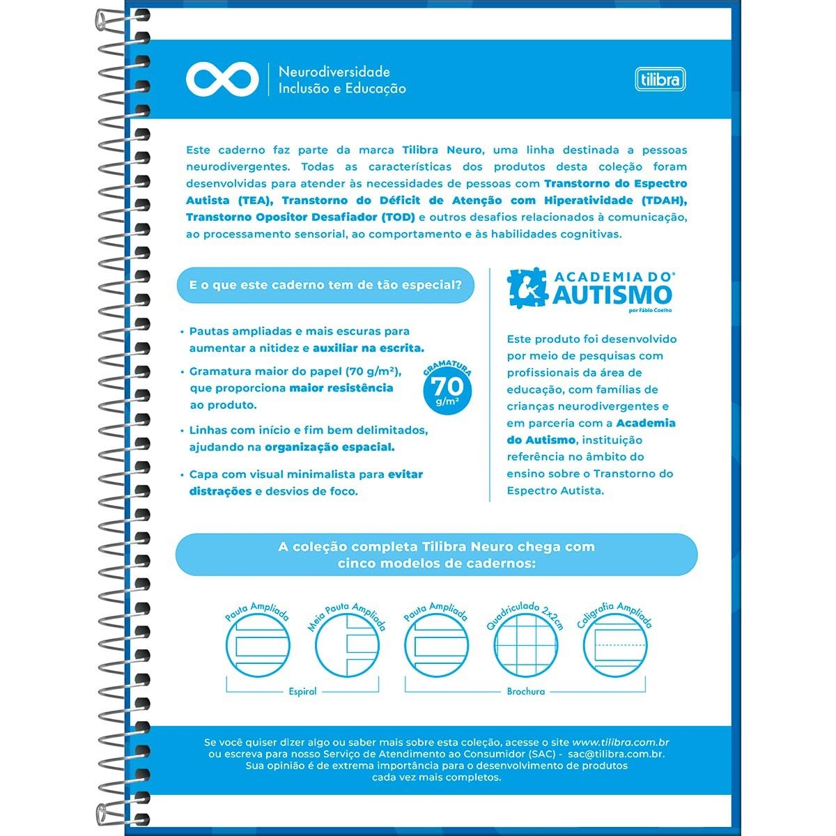A linha Tilibra Neuro chega para atender as necessidades de crianças e jovens com condições como TEA, TDAH, TOD, entre outras, possibilitando que a aprendizagem aconteça de forma plena para todos. Os cadernos desta coleção apresentam folhas com maior gramatura que os cadernos convencionais e pautações ampliadas para facilitar a usabilidade. Os produtos foram desenvolvidos por meio de pesquisas com profissionais, educadores e famílias de crianças neurodiversas. A Academia do Autismo é parceira da Tilibra neste projeto inclusivo.