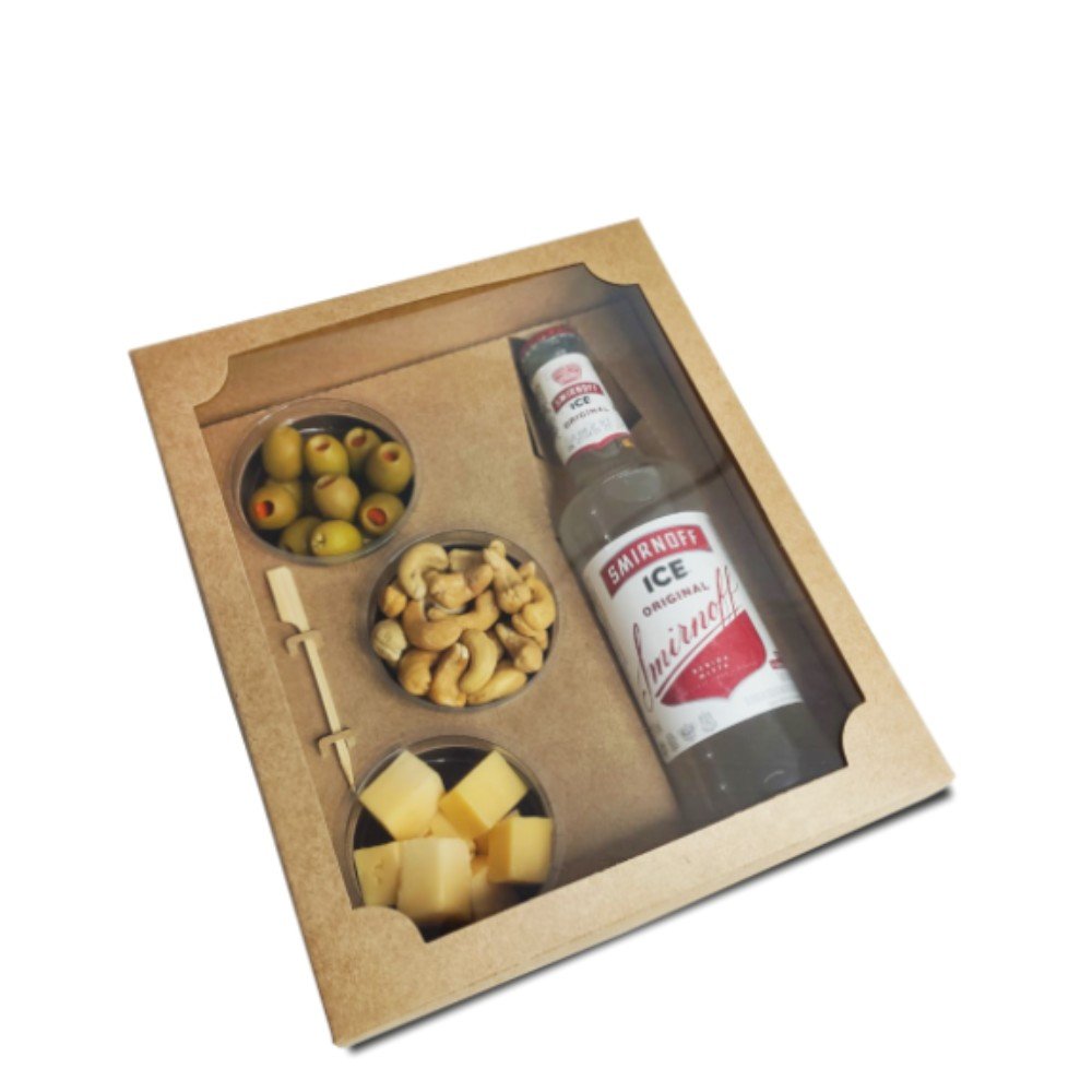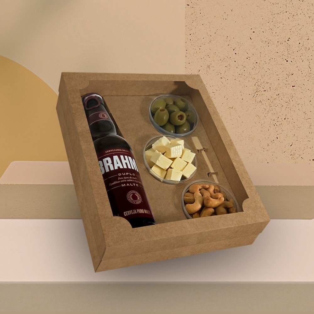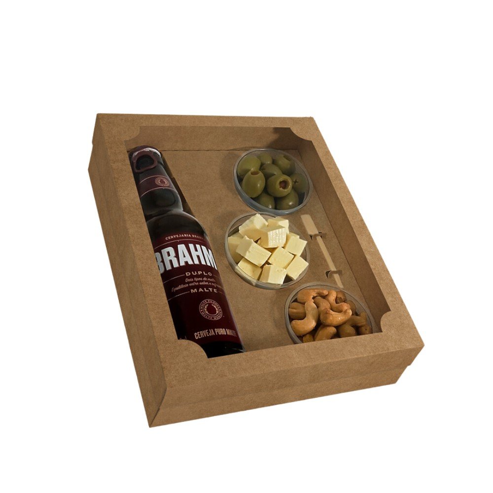 A Caixa para garrafa long neck e 3 petisqueiras é perfeita para enfeitar e deixar mais saboroso e original o seu presente a pessoa que você gosta e admira. Com tampa de acetato transparente o conteúdo da desta caixa ganha um super destaque. A caixa encanta e agrega muito valor ao seu produto, presente ou lembrança.