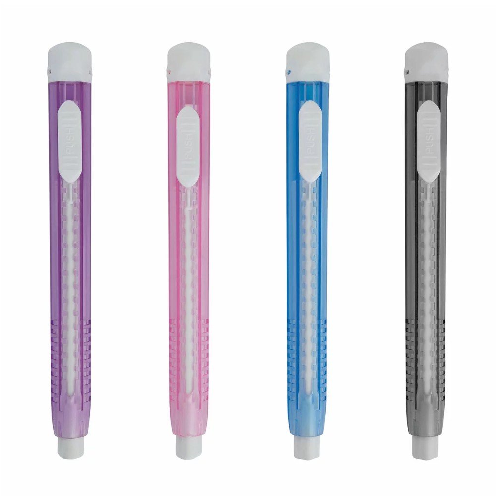 Caneta Borracha Push possui mecanismo retrátil e corpo triangular antideslizante! Com trava para a borracha e excelente desempenho ao apagar. A borracha é livre de PVC e de textura macia.