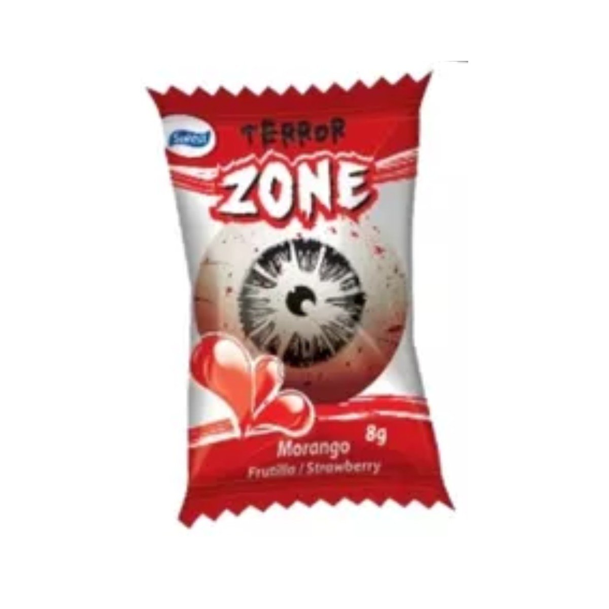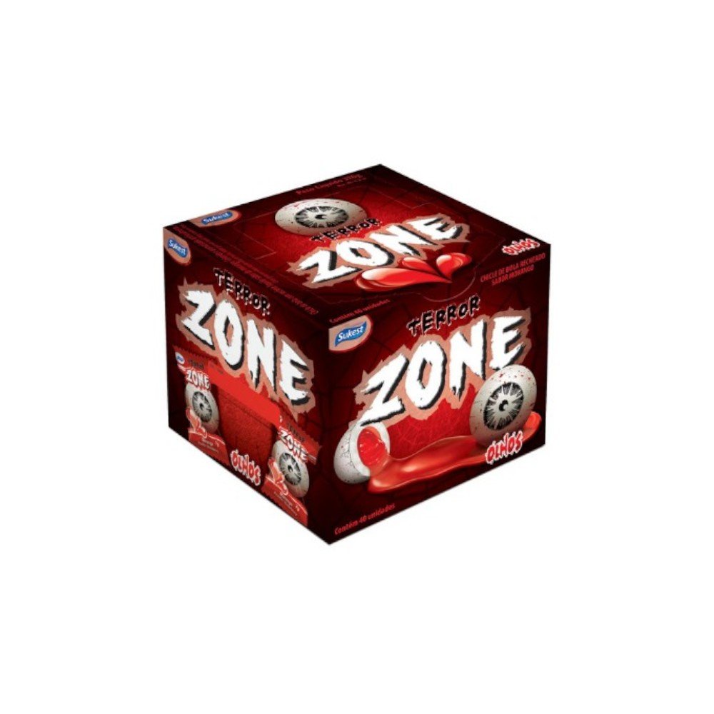 O chiclete Terror Zone veio para causar um terror de sabores em sua vida. Seu formado te olho e seu recheio sabor morango causa uma sensação de estar realmente mascando um olho.