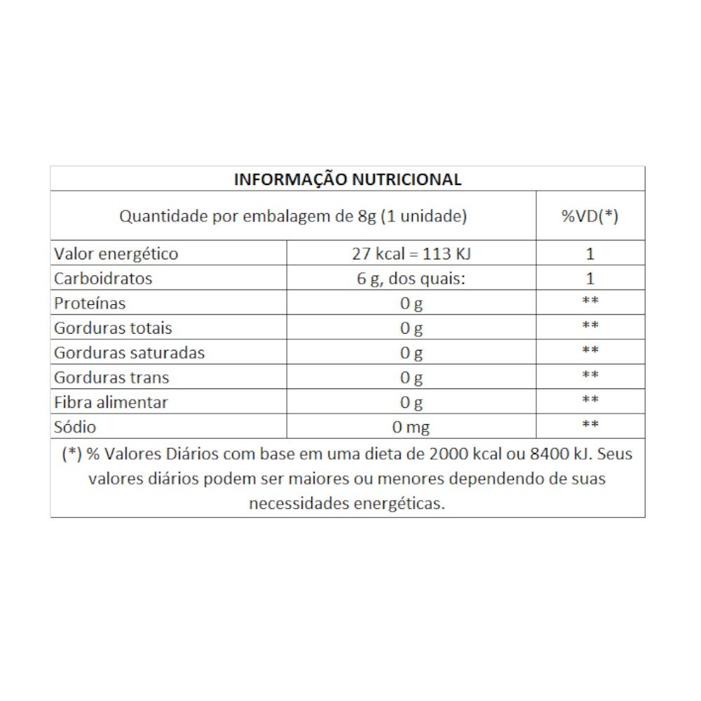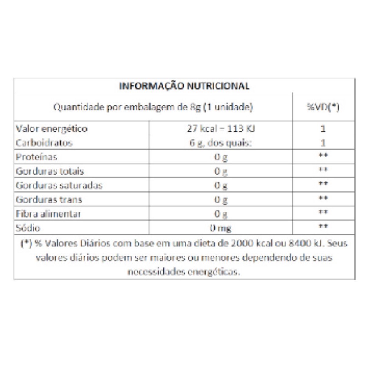 Açúcar, xarope de glicose, goma base, maltodextrina, amido de milho, umectante sorbitol, umectante glicerina, acigulante ácido cítrico, aromatizante idêntico ao natural de morango, estabilizante lecitina de soja, citrato de sódio, cera de carnaúba e corantes.