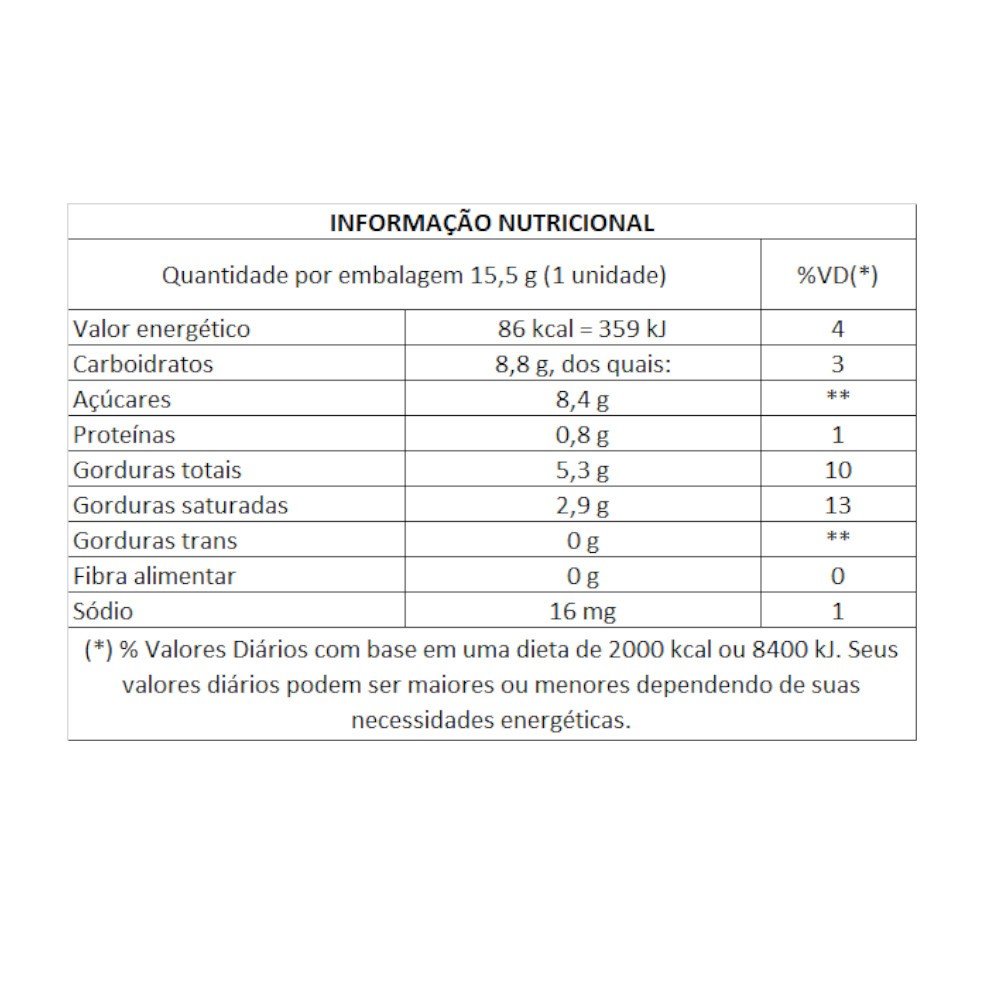 Pode conter trigo, cevada, aveia, centeio, amendoim, amêndoa, avelãs, nozes, castanha-de-caju, castanha-do-pará, coco e látex natural