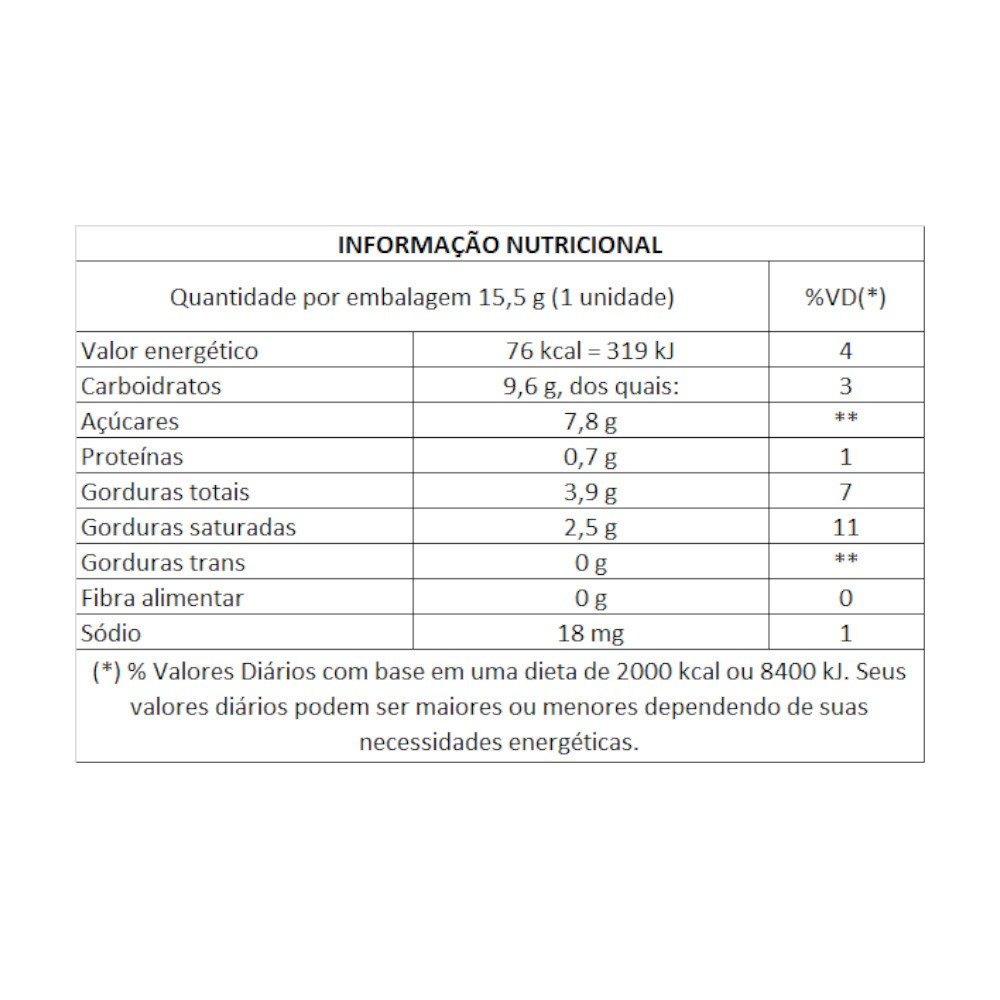 Açúcar, manteiga de cacau, leite integral em pó, leite condensado, confeito sabor chocolate (açúcar, fécula de mandioca, glicose em pó, cacau em pó, óleo vegetal de palmiste, sal, umectante glicerol, emulsificante lecitina de soja, antiumectante silicato de magnésio, espessante goma arábica e aromatizante), massa de cacau, açúcar invertido, xarope de glicose, óleo vegetal de palma hidrogenado, soro de leite em pó, permeado de soro de leite em pó, gordura vegetal, cacau em pó, sal, umectante sorbitol, emulsificantes: lecitina de soja, ésteres de poliglicerol com ácido ricinoléico interesterificado e mono e diglicerídeos de ácidos graxos e aromatizante.