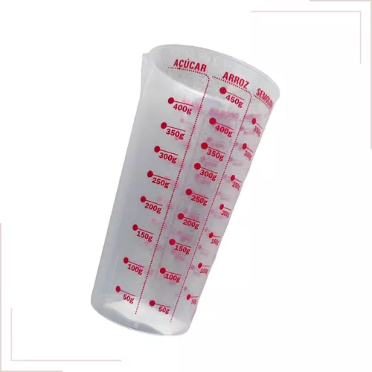 O copo com medidas graduado, da marca Injetemp, contém 7 tipos diferentes de medidas, de açúcar (50-400g), farinha (50-300g), arroz (50-450g), líquido (50-500ml), semolina (50-350g), chocolate (50-450g) e xícara ( ¼ | ½ | ¾ | 1 | 1 ¼ | 1 ½ | 1 ¾ | 2 ).