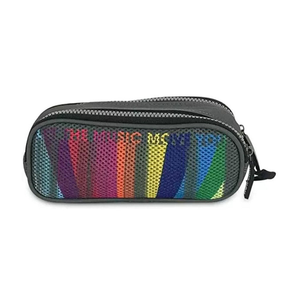 Estojo duplo confeccionado em lona resinada, com detalhe telado estampado, puxadores personalizados e detalhes refletivos.