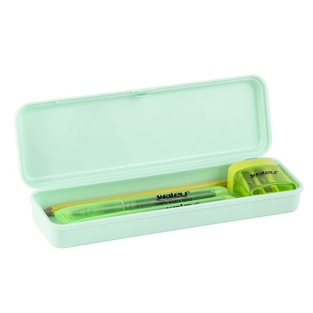 O estojo waleu é fabricado em pp polipropileno, possui formato retangular e seu compartimento interno é amplo. ideal para armazenar lápis, borracha, apontadores e etc.