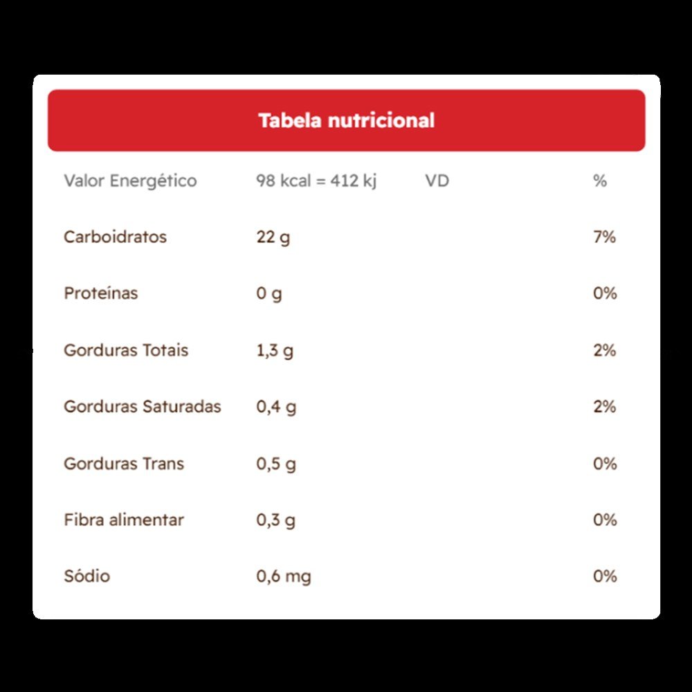 Açúcar, glicose, gordura vegetal, amido, emulsificante lecitina de soja (ins 322), estabilizante goma arábica (ins 414), corantes artificiais: azul brilhante (ins 133), amarelo crespúsculo (ins 110), dióxido de titânio (ins 171), vermelho allura (ins 129) e corantes naturais amarelo cúrcuma (ins 100)e vermelho carmim (ins 120) e antiumectante glicerina (ins 422). Não contém glútem. “alérgicos: contém derivados de soja. Pode conter leite e amendoim.”