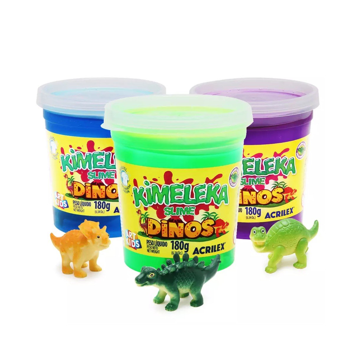 A Kimeleka Slime Dinos da Acrilex proporciona diversão garantida com muito tema pré-histórico! Com textura macia e elástica, permite apertar, esticar e modelar, estimulando a criatividade e a coordenação motora das crianças de forma lúdica.