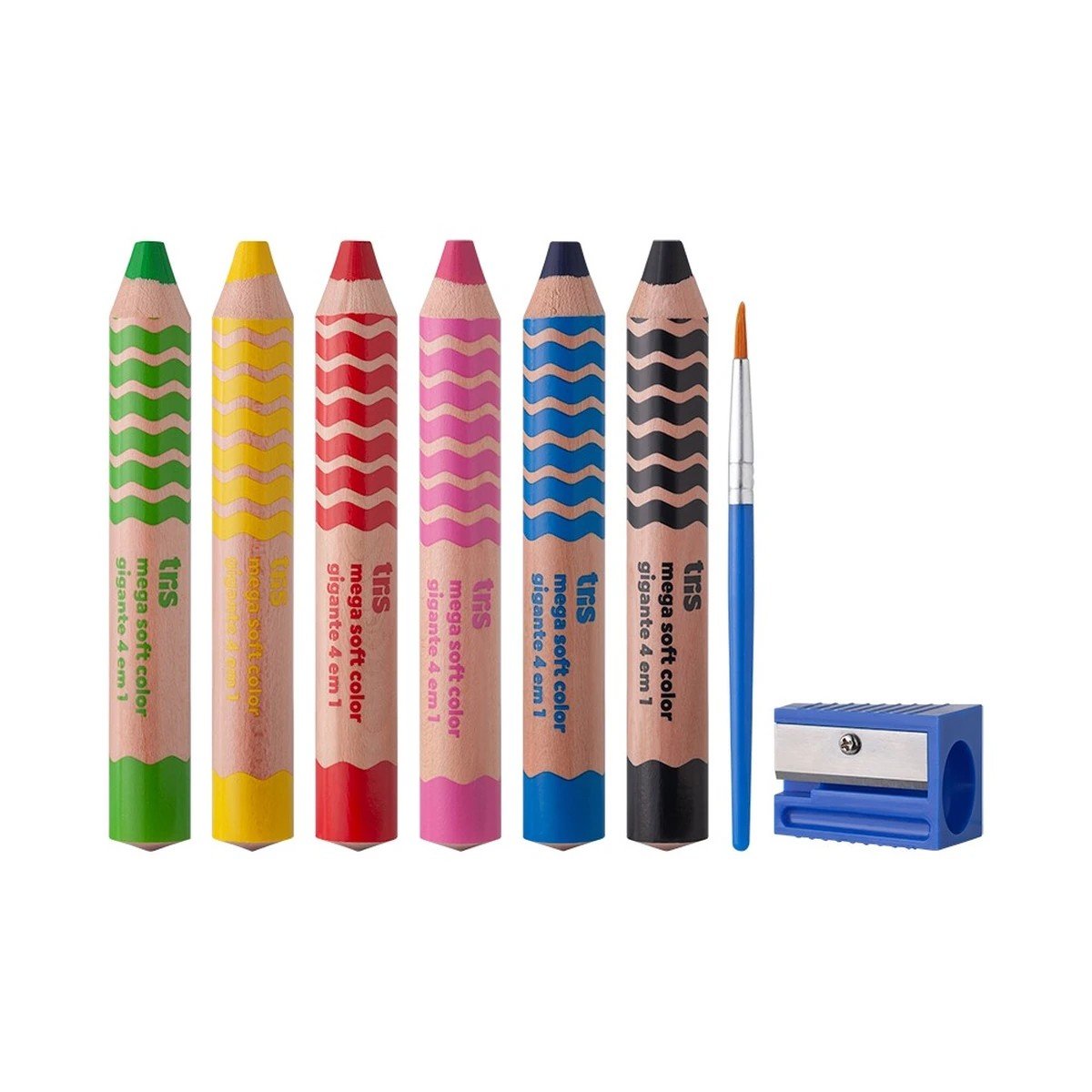 O lápis de cor gigante MEGA é 4 em 1: lápis de cor, giz de cera, giz de vidro e é aquarelável! Com cores super intensas e corpo redondo jumbo. Acompanha pincel e apontador.
