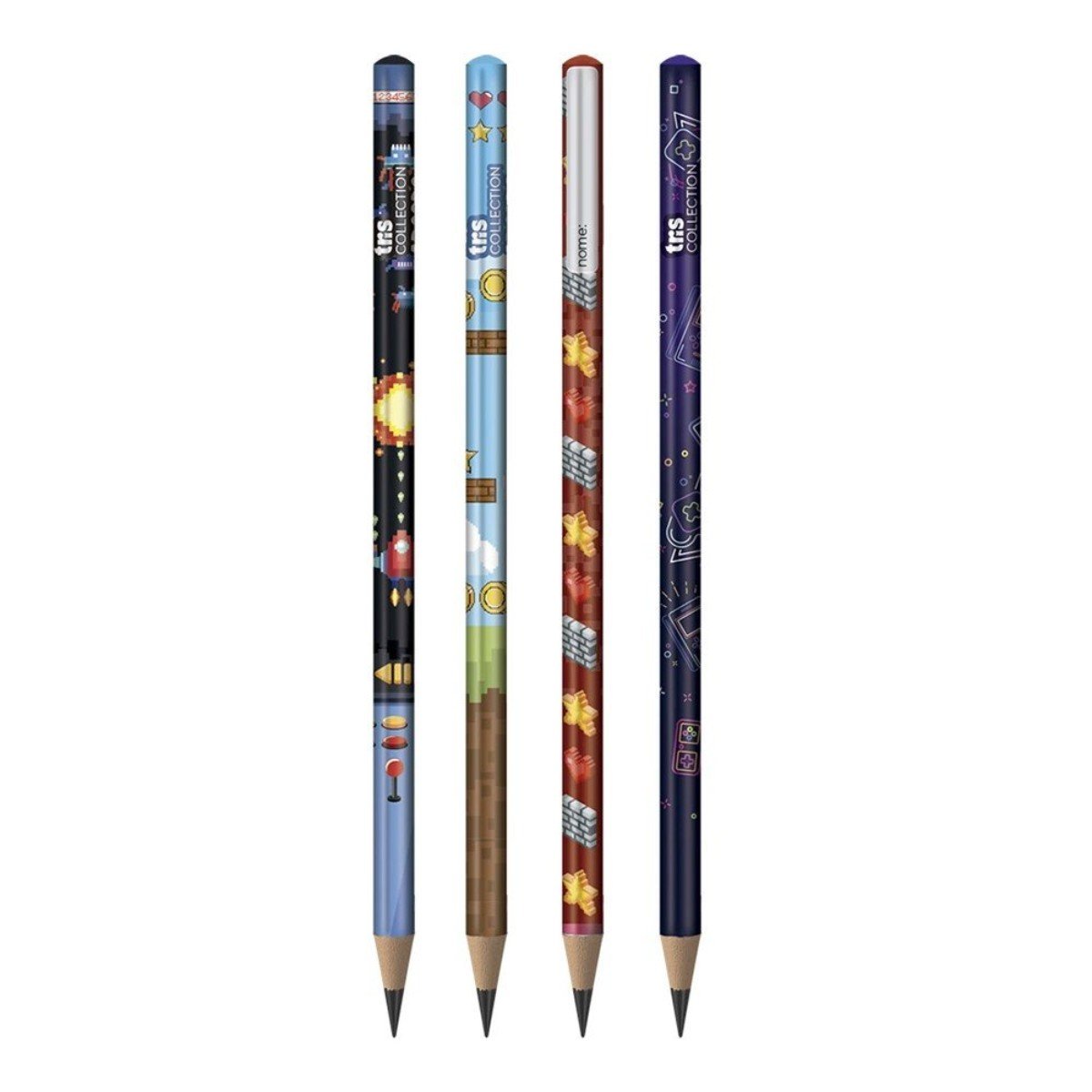 Os lápis Collection possuem estampas divertidas e são super colecionáveis. Inspirado nos videogames clássicos, o lápis grafite Arcade conta com 4 estampas e possui efeito metalizado e espaço para colocar o nome.