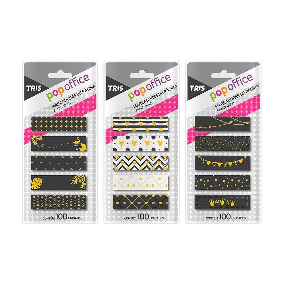 3 lindas coleções de estampas metalizadas para você escolher! Os marcadores de página Pop Office Fancy Gold vão te ajudar a marcar as suas páginas de um jeito super prático e lindo! De fácil aplicação.