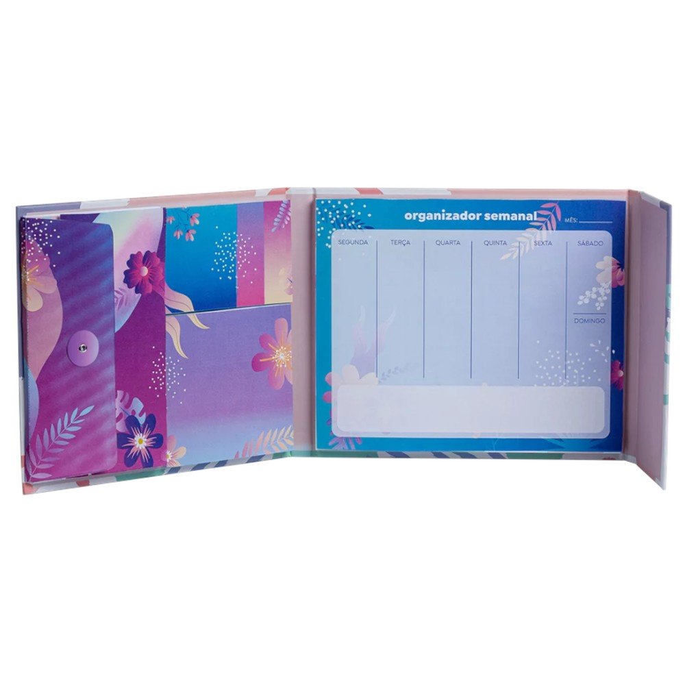 O organizador semanal Orvalho possui capa rígida com fechamento magnético, envelope interno de papel, 2 blocos de marcadores de páginas de 20x60mm com 50 folhas, 1 bloco de notinhas autoadesivas de 50x60mm com 50 folhas, 1 bloco de notinhas destacáveis de 92x90mm com 50 folhas e 1 bloco planner semanal autoadesivo de 185x155mm com 50 folhas.