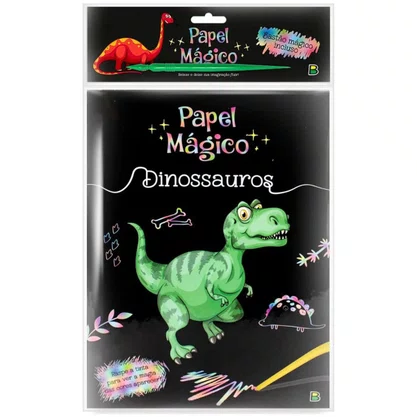 O Papel Mágico Todolivro é uma forma divertida e criativa de estimular a imaginação das crianças! Com um simples toque do bastão mágico, desenhos incríveis e coloridos de dinossauros ganham vida sobre o fundo preto, proporcionando uma experiência encantadora de arte e descoberta. Cada risco revela uma nova cor, tornando a atividade ainda mais envolvente e surpreendente.