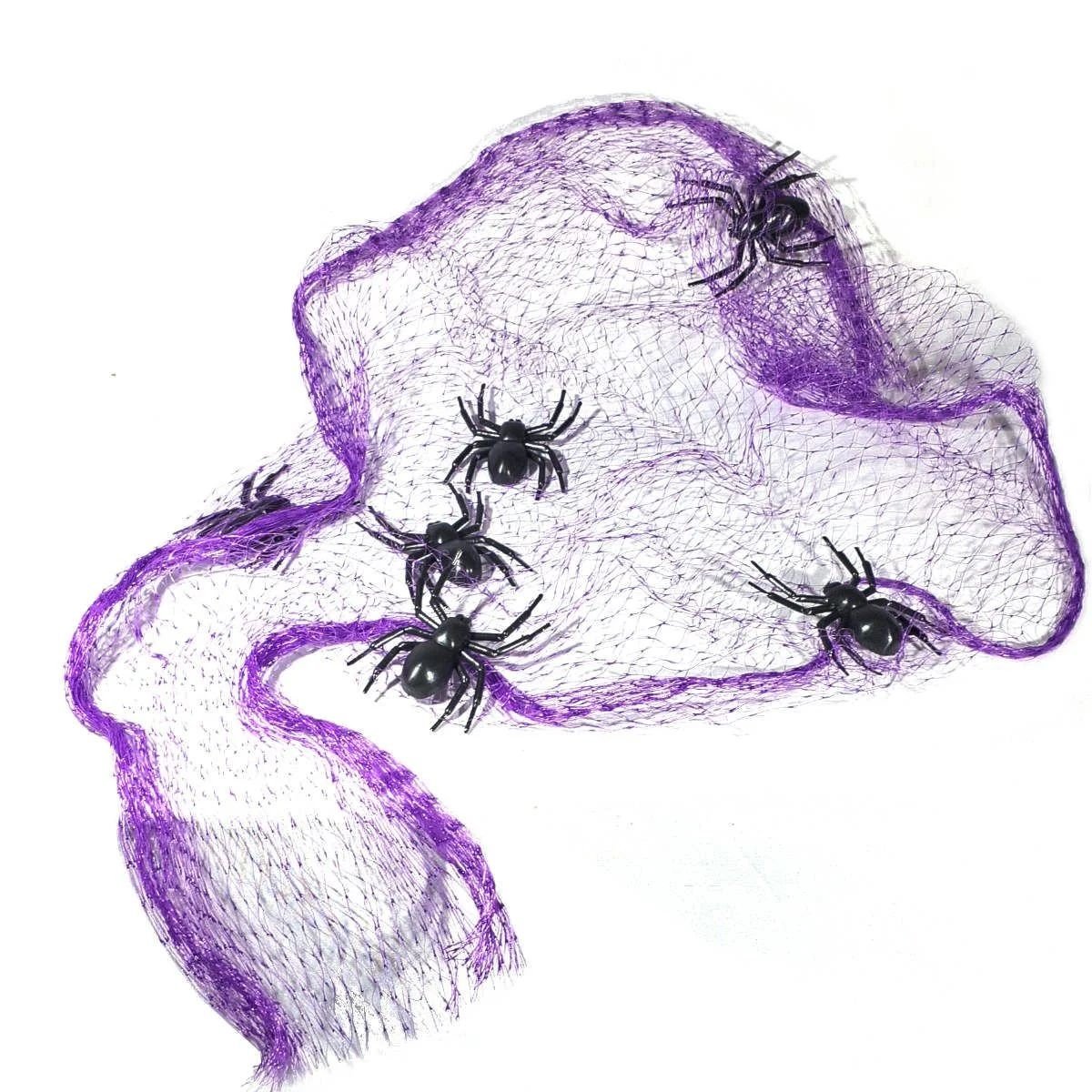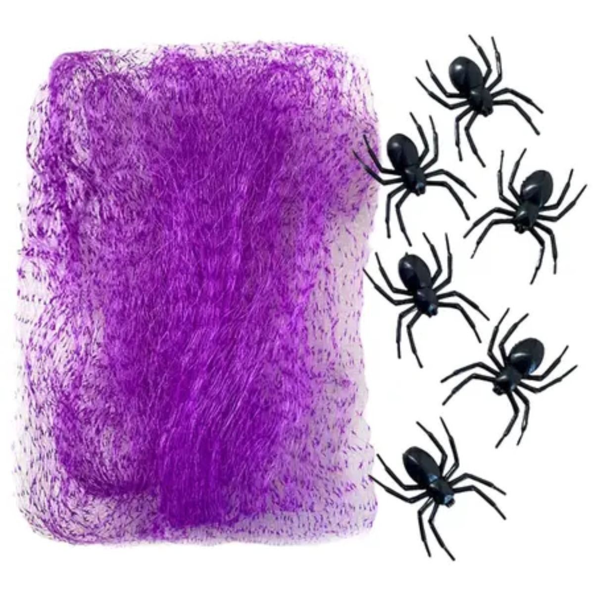 Teia de aranha artificial com 06 aranhas de plástico, ideal para decorações temáticas de festas como Halloween ou para compor cenários assustadores. Fácil de esticar e prender, proporcionando um efeito realista e assustador.