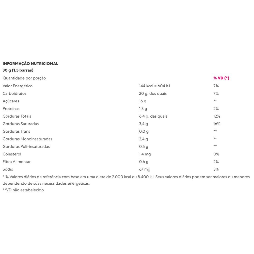 Açúcar, xarope de glucose, farinha de trigo enriquecida com ferro e ácido fólico, óleo de palma, leite em pó, massa de cacau, manteiga de cacau, dextrose, lactose, gordura láctea, cacau em pó, sal, emulsificantes (sais de amônio do ácido fosfatídico e lecitina de soja), regulador de acidez bicarbonato de sódio, aromatizante.